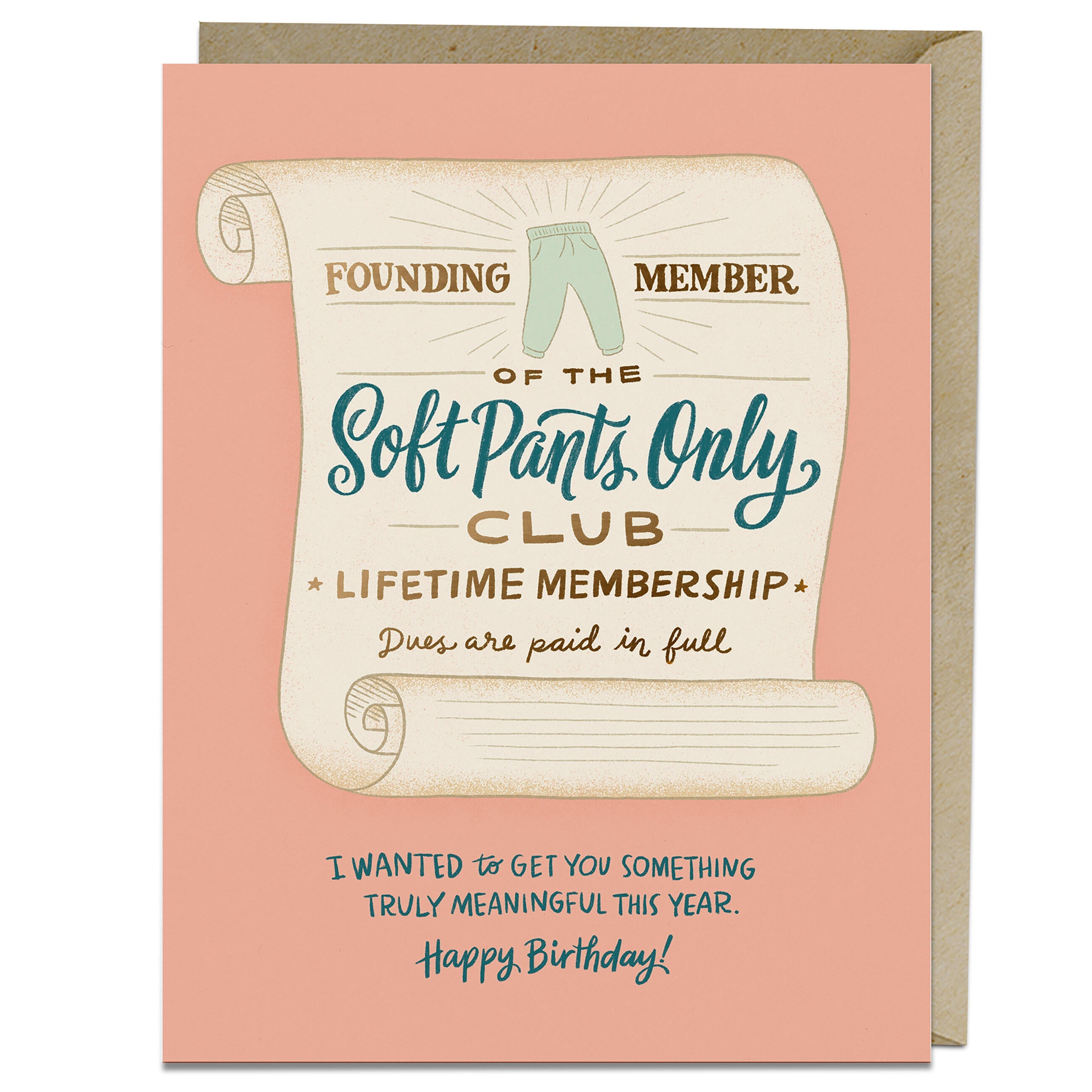 Skinny jeans? No thank you! Over here at Em & Friends, soft pants are practically a uniform. We thought it was time to make our commitment official, so we made this birthday card for the soft pants lover in all of us. May your year ahead include a lot fewer zippers, button flies, and scratchy fabrics, and a lot more stretchy waistbands, elastic ankle cuffs and deep pockets.