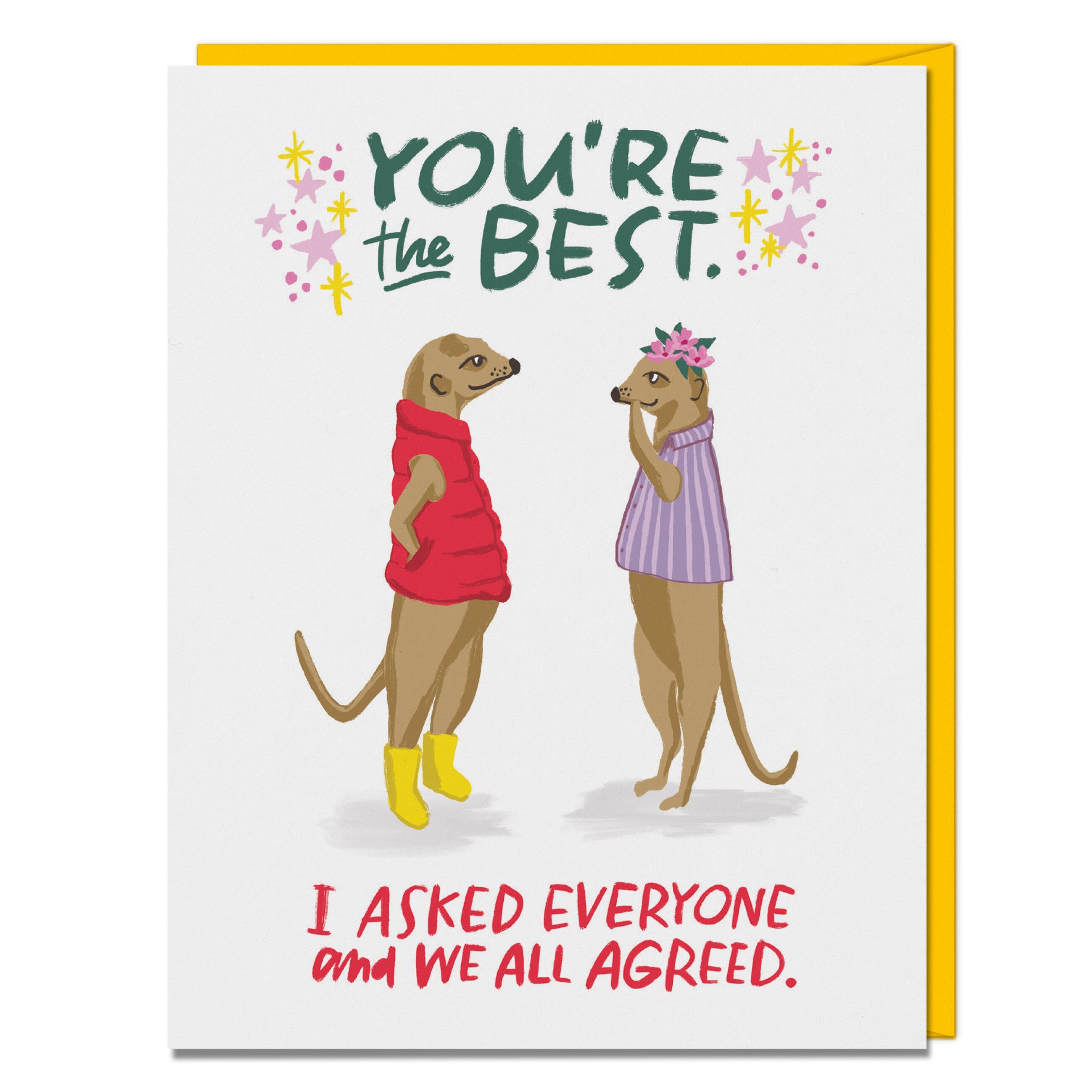 This card is a definite crowd-pleaser—partly because of the meerkats in lil’ outfits, and partly because it works for so many occasions: birthday, thank-you, congratulations, “just because,” National Thank-a-Mail-Carrier Day (Feb. 4!) … we could go on.