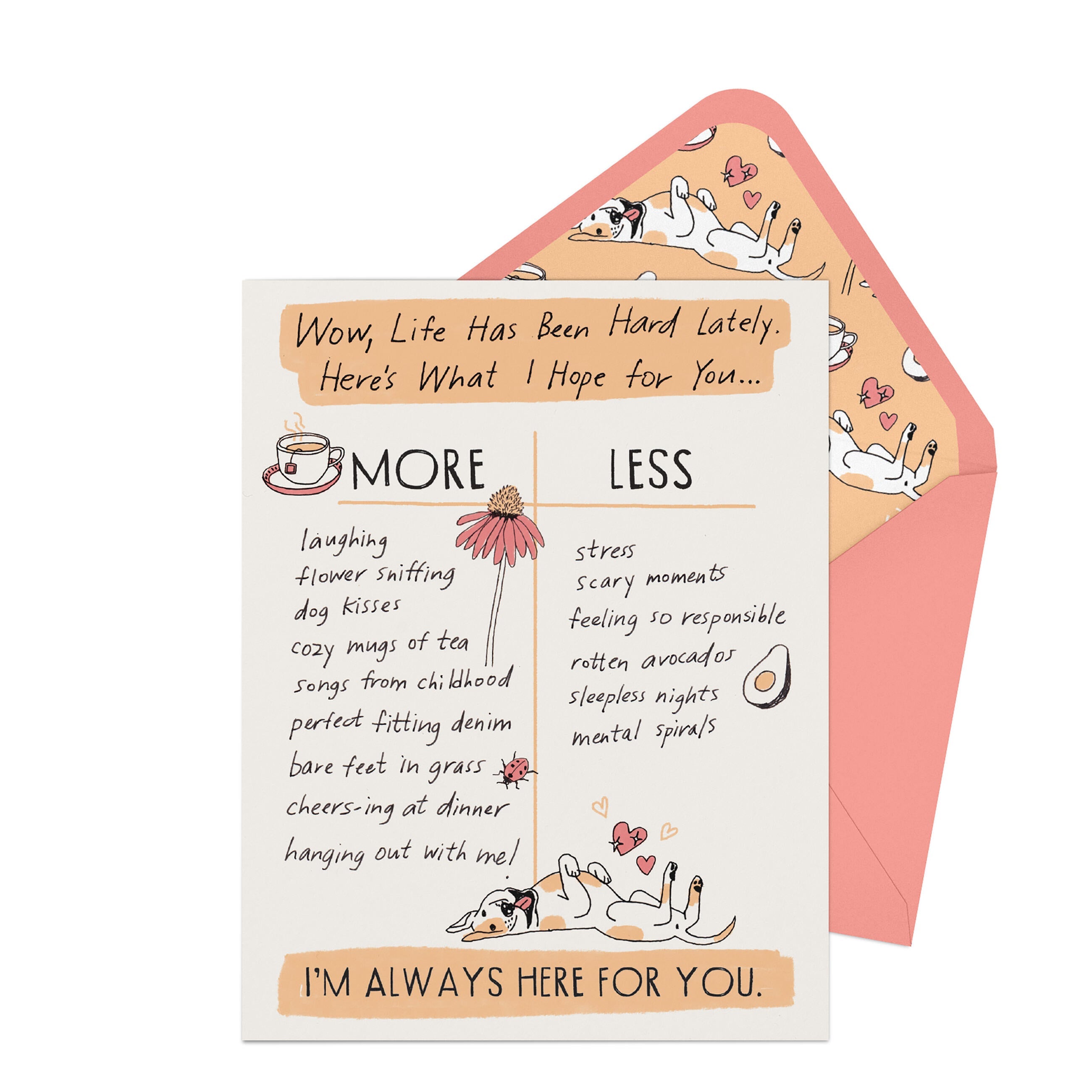 When life has been hard lately for someone you care about, this card can lift their spirits… and let them know you’re always here for them too. Wishing someone MORE laughing, cozy mugs of tea, and hanging out with you and LESS stress, scary moments, and mental spirals. What could be more supportive than that?