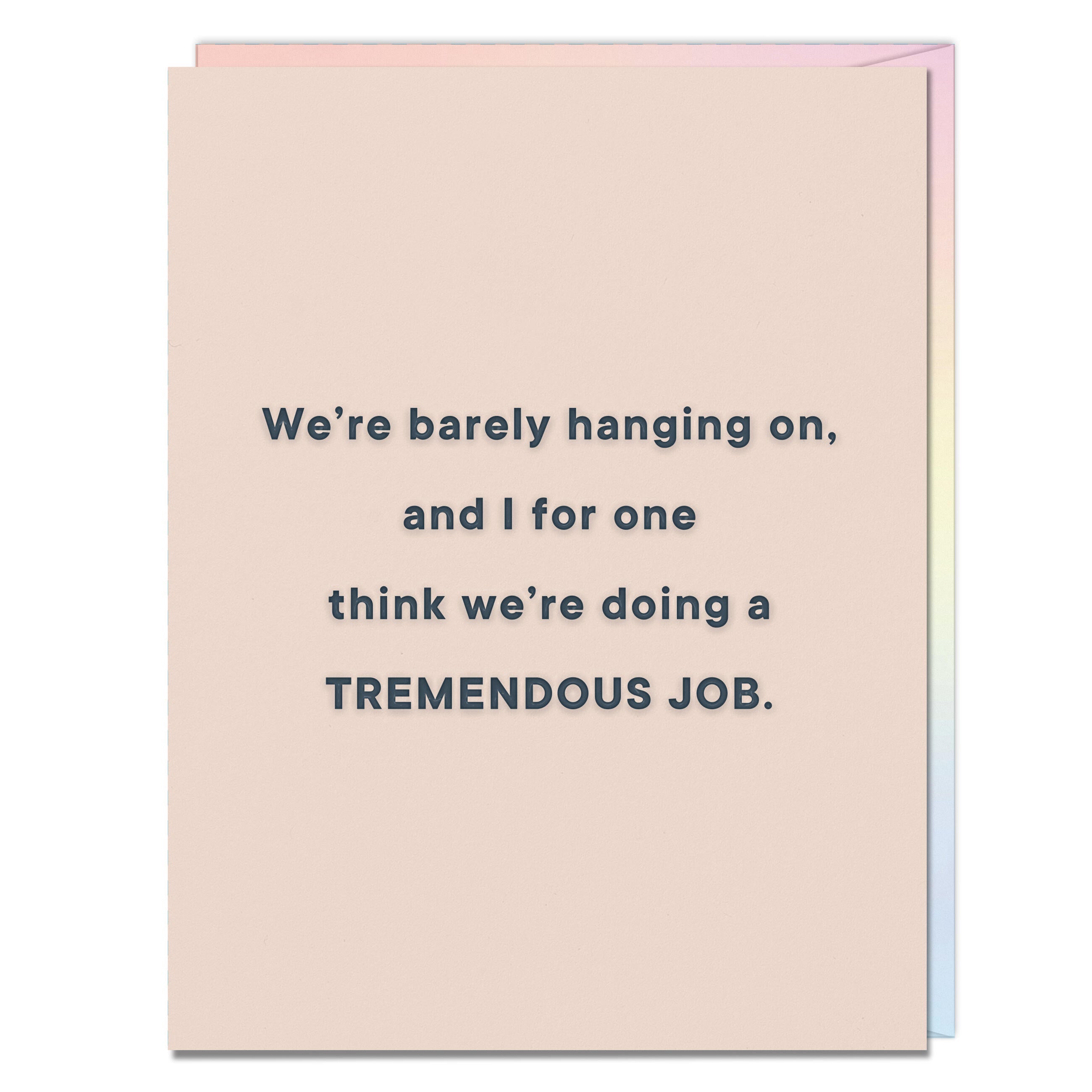 Card reads: We're barely hanging on, and I for one think we're doing a TREMENDOUS JOB.