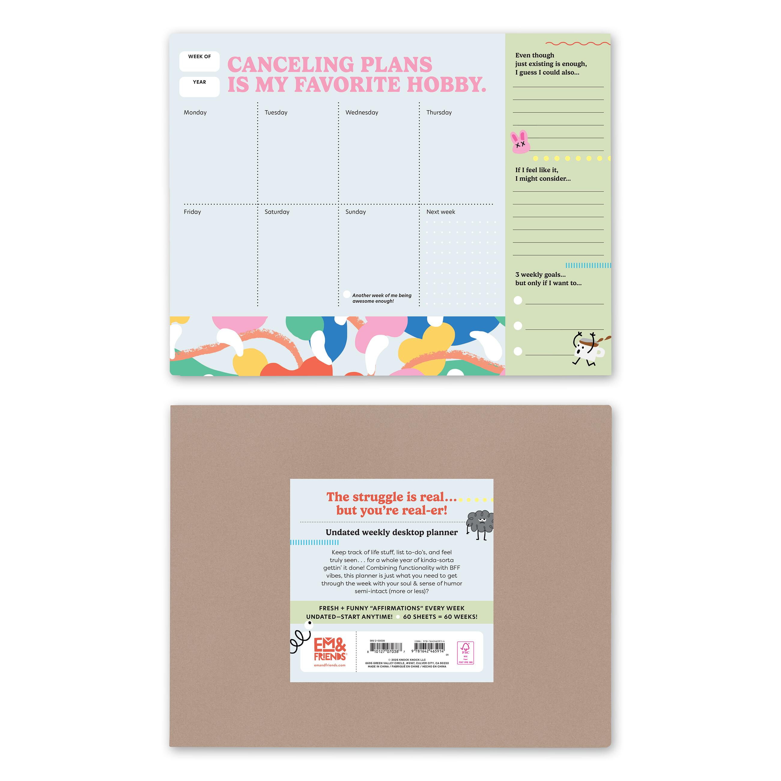 THE STRUGGLE IS REAL — and this undated desktop planner can relate! It’s chock full of supportive and snarky commentary, encouraging you to show up and plan just as you are. No judgement from these 60 weeks of functional space as you live your best life — or don’t, it’s up to you! With sections for to-do lists, setting 3 attainable weekly goals (but only if you feel like it!) and a space to plan for next week, this desktop planner pad gets you, and will help you get things done.