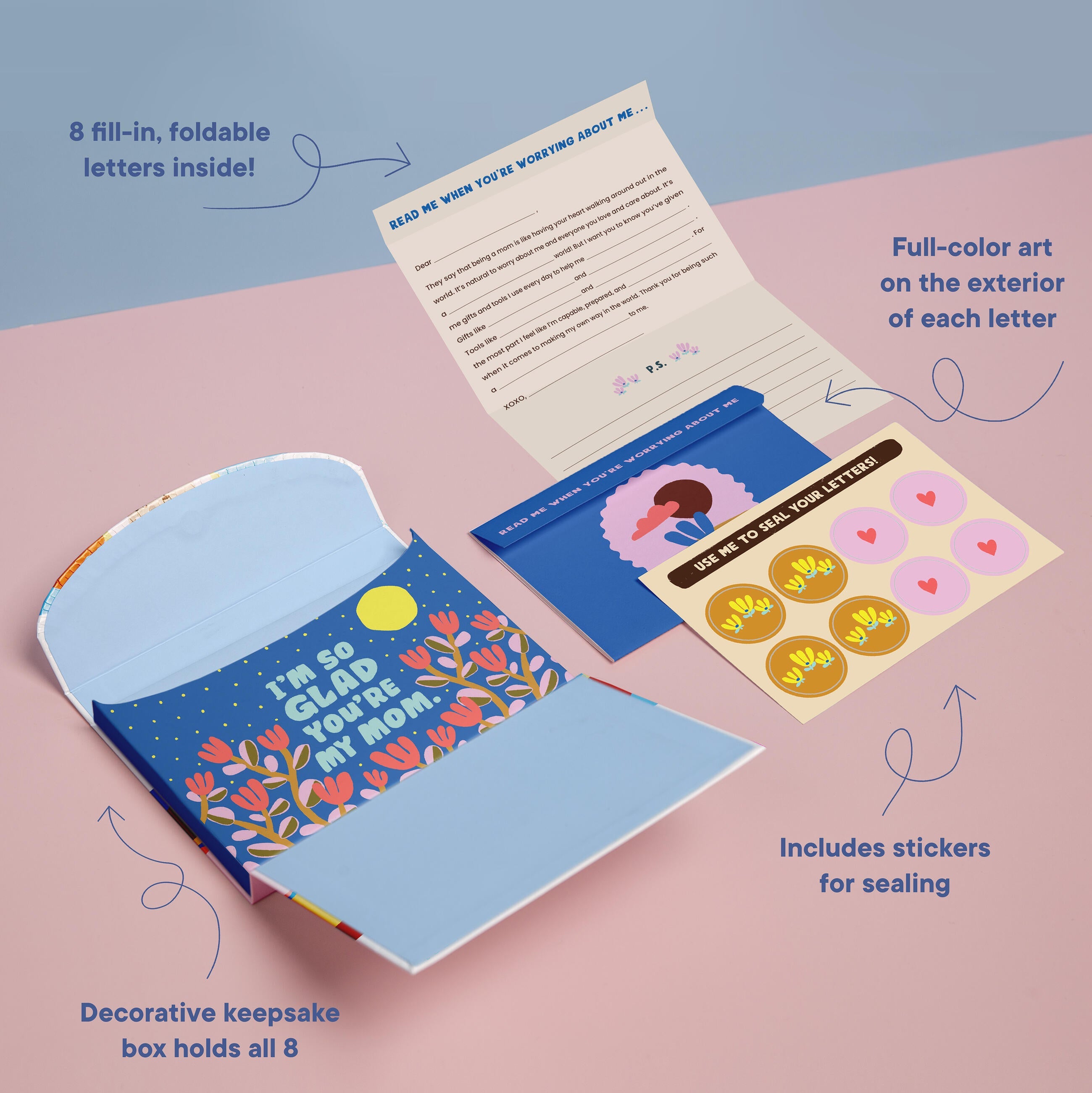 - 8 customizable, fill-in-the-blank letters with special sealing stickers in a super cute keepsake box; 6 inches x 4.25 inches