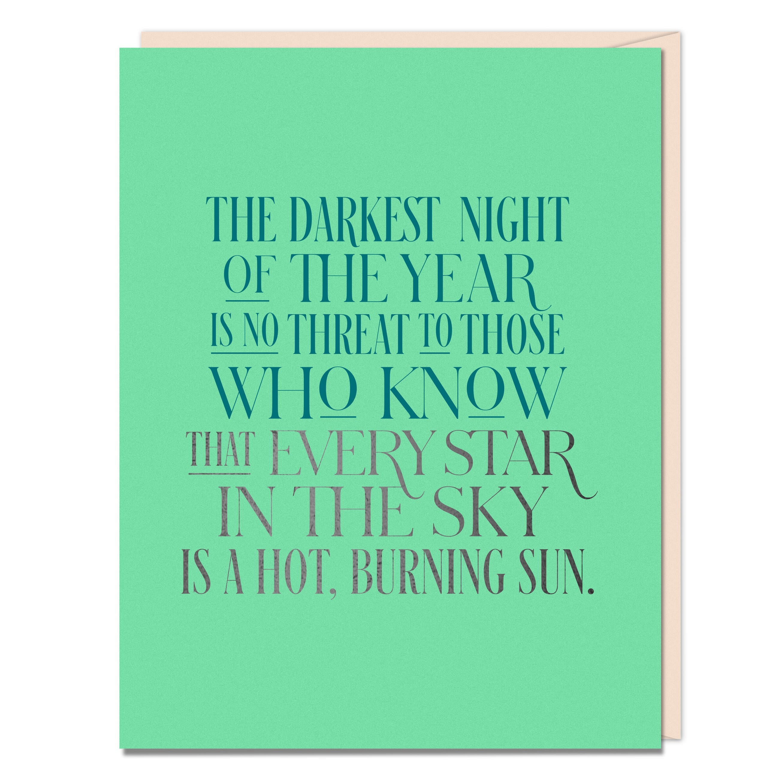 Card reads: The darkest night of the year is no threat to those who know that every star in the sky is a hot, burning sun.